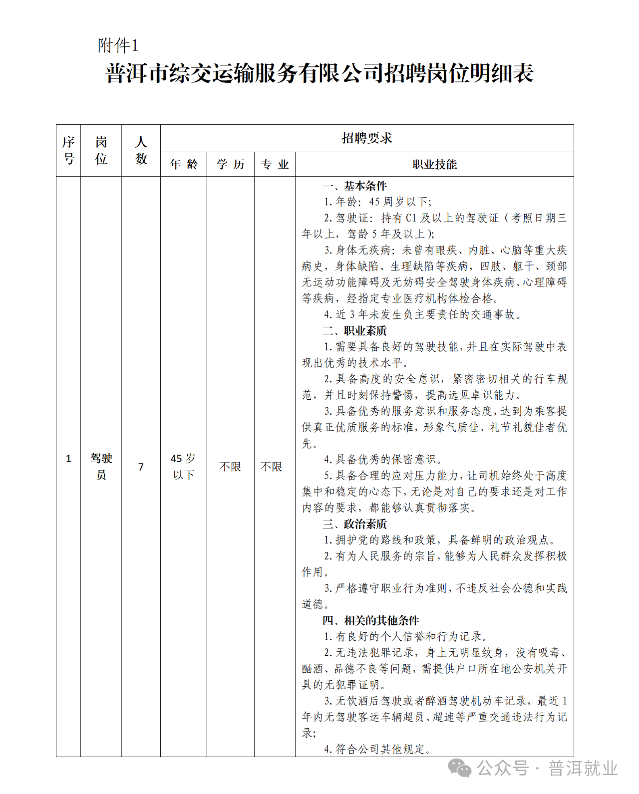 普洱綜交運(yùn)輸服務(wù)有限公司2024年公務(wù)車駕駛員招聘公告