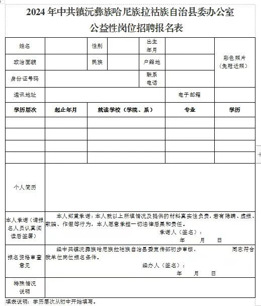 附件:2024年中共鎮(zhèn)沅縣委辦公室公益性崗位招聘報(bào)名表