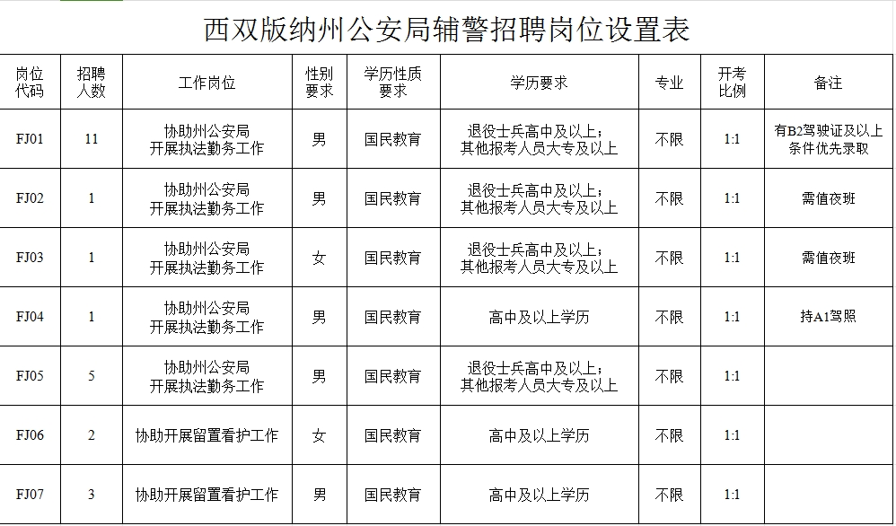 在西雙版納州公安局內設機構從事勤務工作的輔警,輔警不具有人民警察和公務員身份,不行使人民警察職權。本次共招聘24人,詳見《西雙版納州公安局輔警招聘崗位設置表》(附件1)。