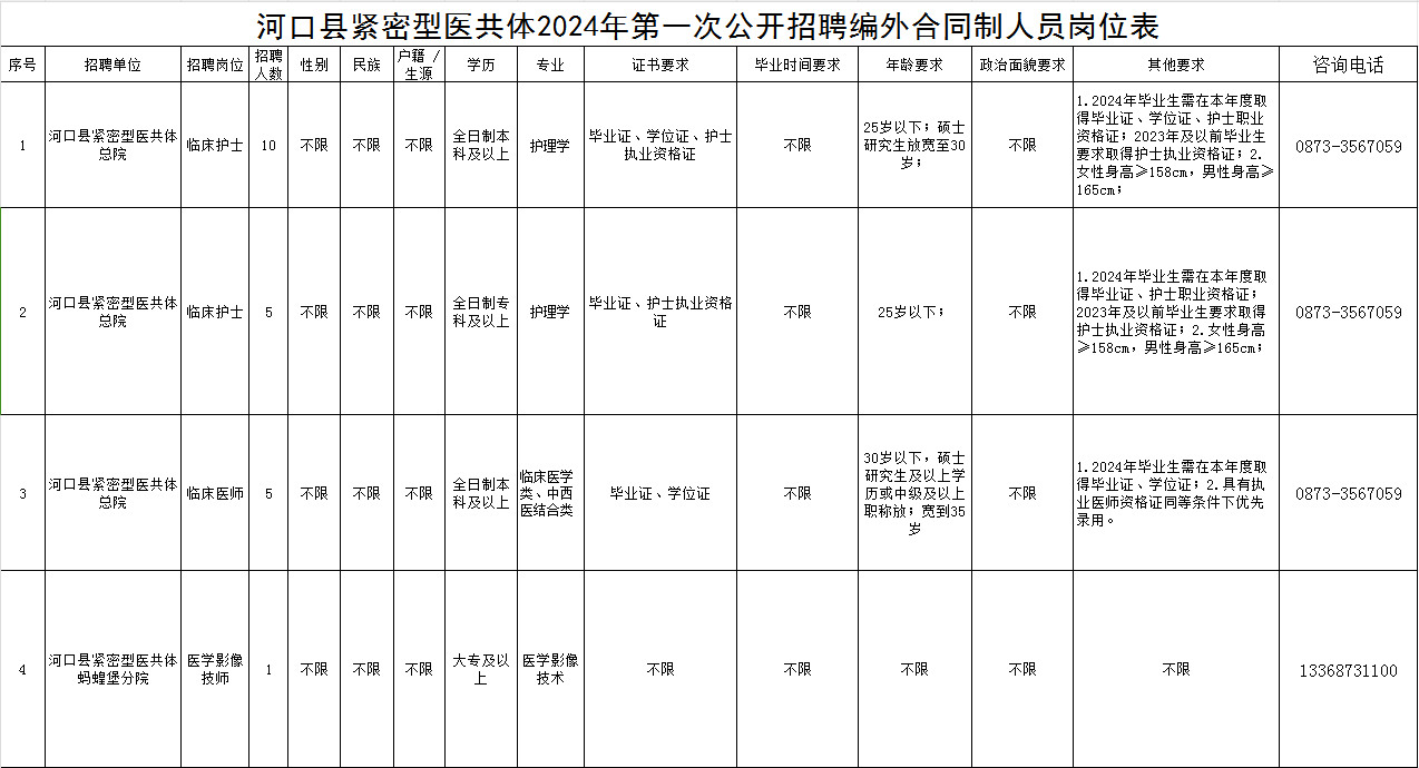 具體詳見《河口縣緊密型醫(yī)共體2024年第一次公開招聘編外合同制人員崗位表》(附件1)
