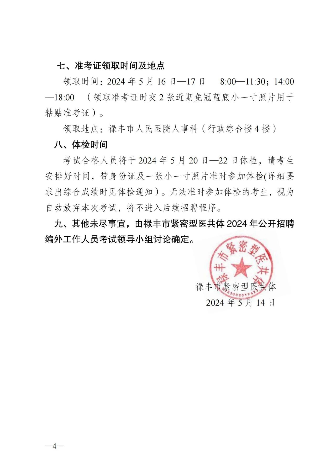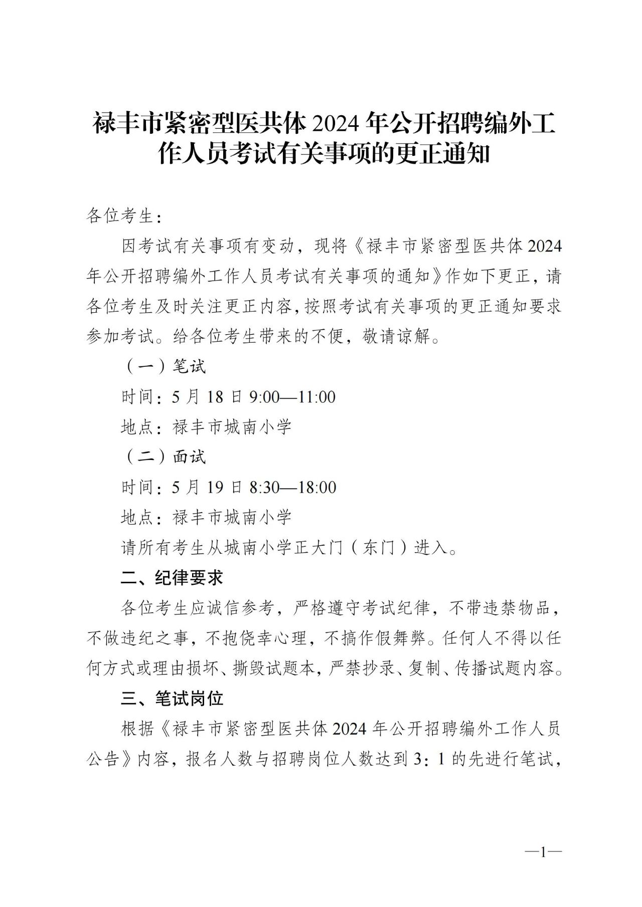 祿豐市緊密型醫(yī)共體2024年公開招聘編外工作人員考試有關(guān)事項的更正通知