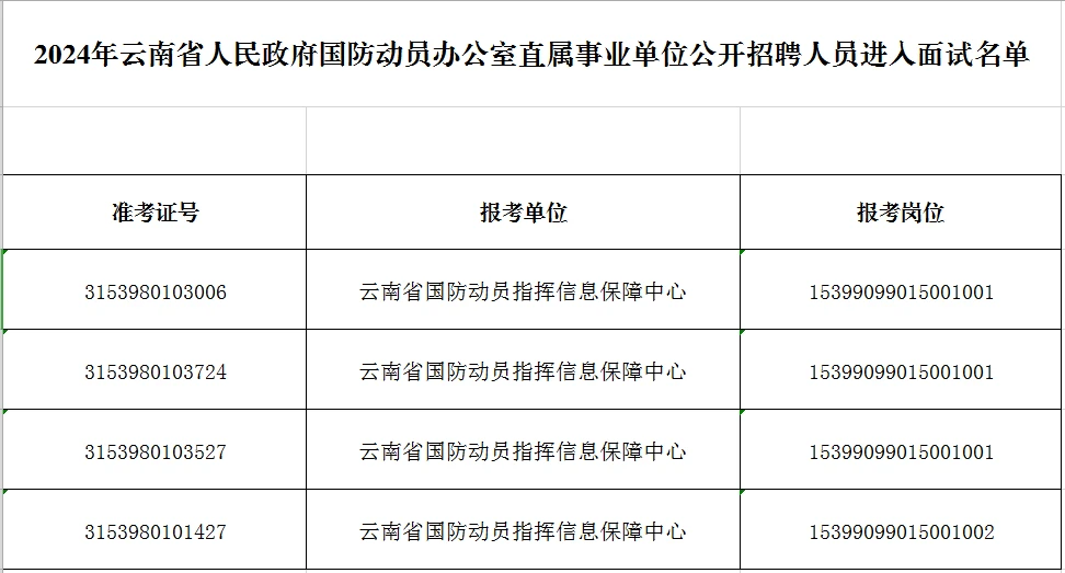 附件:2024年云南省人民政府國防動員辦公室直屬事業(yè)單位公開招聘人員進(jìn)入面試名單.xls