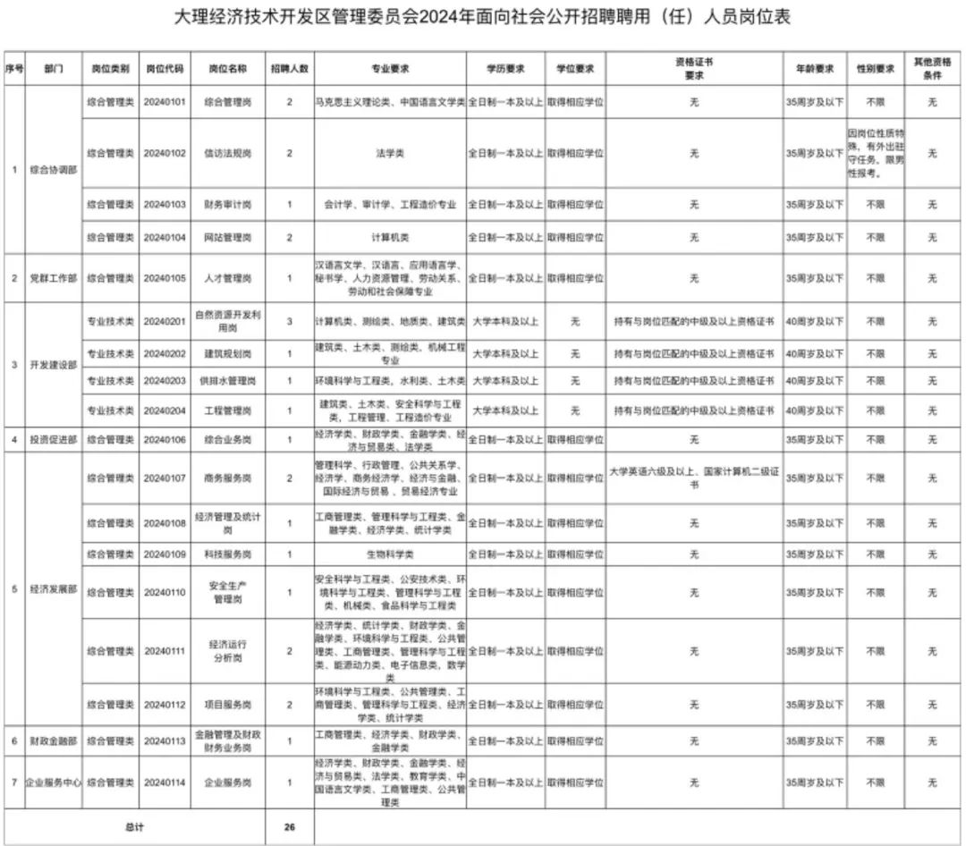 附件:大理經(jīng)濟技術(shù)開發(fā)區(qū)管理委員會2024年面向社會公開招聘聘用(任)人員崗位表