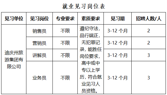 迪慶州旅游集團設置就業(yè)見習崗位10個,擬招聘青年就業(yè)見習人員10人(詳見下表)。
