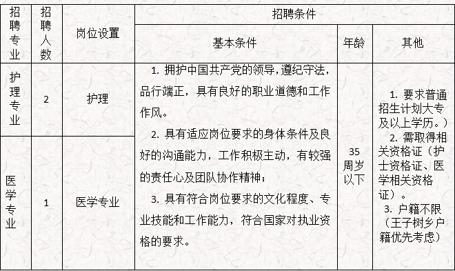 為適應(yīng)王子樹衛(wèi)生健康事業(yè)發(fā)展工作需要,進(jìn)一步充實(shí)王子樹鄉(xiāng)衛(wèi)生院隊(duì)伍建設(shè),不斷提高醫(yī)療服務(wù)質(zhì)量,更好的滿足廣大人民群眾健康需求,改善臨床科及護(hù)理人員緊缺狀況。隴川縣王子樹衛(wèi)生院面向社會(huì)公開招聘編外工作人員3人,現(xiàn)將有關(guān)招聘事宜公告如下: