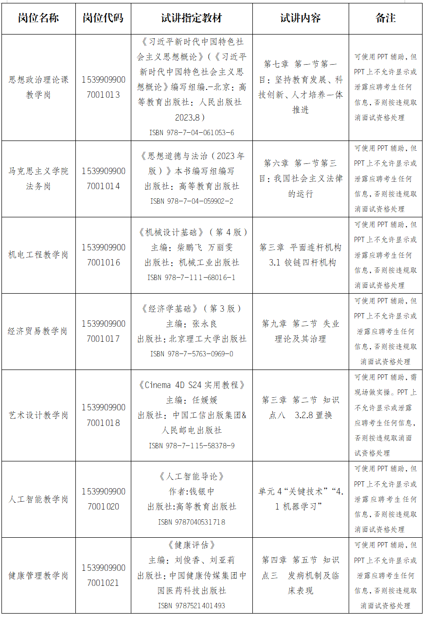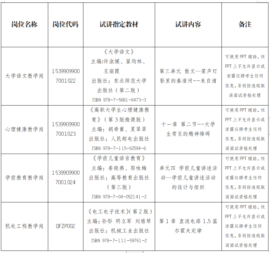 2.教學(xué)崗位采用“試講+結(jié)構(gòu)化面試”的方式進行測試,時間:試講10分鐘,結(jié)構(gòu)化面試5分鐘,共計15分鐘。包括:15399099007001013(思想政治理論課教學(xué)崗)、15399099007001014(馬克思主義學(xué)院法務(wù)崗)、15399099007001016 (機電工程教學(xué)崗)、15399099007001017(經(jīng)濟貿(mào)易教學(xué)崗)、15399099007001018(藝術(shù)設(shè)計教學(xué)崗)、15399099007001020(人工智能教學(xué)崗)、15399099007001021(健康管理教學(xué)崗)、15399099007001022(大學(xué)語文教學(xué)崗),15399099007001023(心理健康教學(xué)崗)、15399099007001024(學(xué)前教育教學(xué)崗)、QFZP002(機電工程教學(xué)崗)。