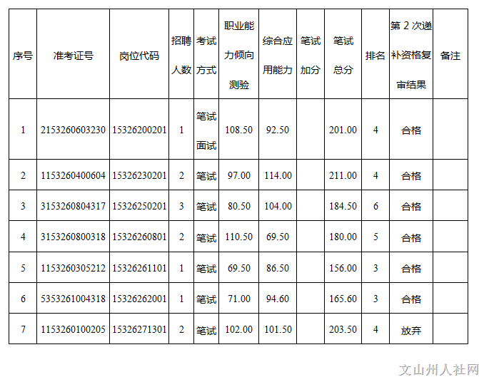 根據(jù)《2024年文山州事業(yè)單位公開招聘工作人員通告》《2024年文山州事業(yè)單位公開招聘工作人員筆試成績最低合格分?jǐn)?shù)及資格復(fù)審有關(guān)事項通告》要求,5月18日全州事業(yè)單位公開招聘工作人員第2次遞補(bǔ)資格復(fù)審工作已結(jié)束,現(xiàn)將第2次遞補(bǔ)資格復(fù)審結(jié)果公示如下。