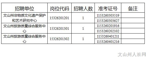 報(bào)考非物質(zhì)文化遺產(chǎn)保護(hù)和藝術(shù)研究中心、文山州旅游質(zhì)量綜合服務(wù)中心崗位,通過筆試并按開考計(jì)劃數(shù)1:2的比例進(jìn)入資格復(fù)審且資格復(fù)審合格的人員確定為進(jìn)入面試人員,名單如下。