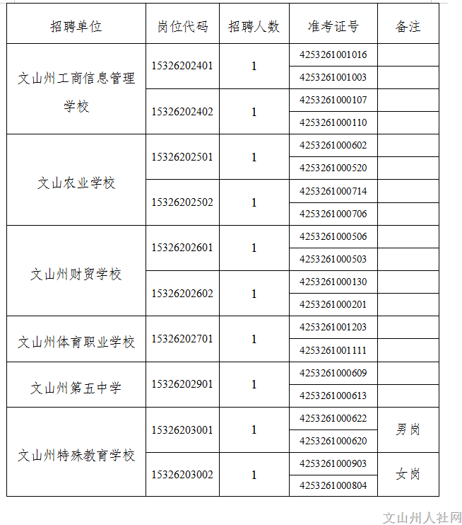 報(bào)考文山州工商信息管理學(xué)校、文山農(nóng)業(yè)學(xué)校、文山州財(cái)貿(mào)學(xué)校、文山州體育職業(yè)學(xué)校、文山州第五中學(xué)、文山州特殊教育學(xué)校教師崗位,通過(guò)筆試并按開(kāi)考計(jì)劃數(shù)1:2的比例進(jìn)入資格復(fù)審且資格復(fù)審合格的人員確定為進(jìn)入面試人員,名單如下。