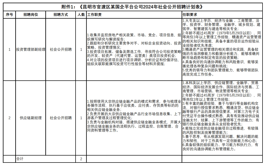 附件1:《昆明市官渡區(qū)某國企平臺公司2024年社會公開招聘計(jì)劃表》