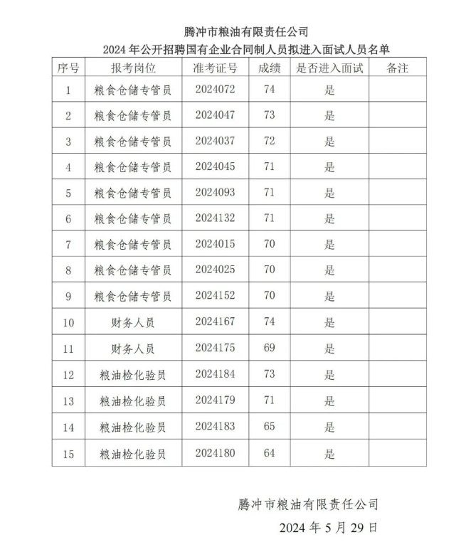 附件:騰沖市糧油有限責(zé)任公司2024年公開招聘國(guó)有企業(yè)合同制人員擬進(jìn)入面試人員名單