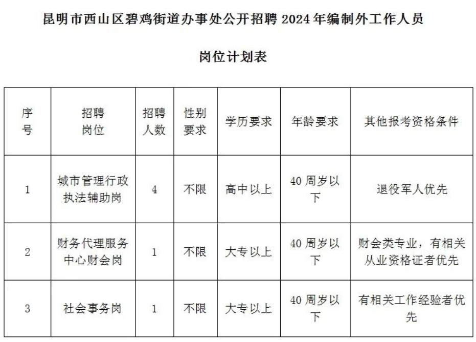 一、此次面向社會(huì)公開(kāi)招聘昆明市西山區(qū)碧雞街道辦事處城市管理行政執(zhí)法輔助崗4名、財(cái)務(wù)代理服務(wù)中心財(cái)會(huì)崗1名、社會(huì)事務(wù)崗1名,共計(jì)6人(性別不限)