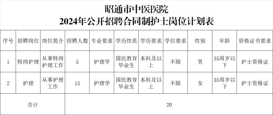 招聘護理人員20名,詳見《昭通市中醫(yī)醫(yī)院2024年公開招聘合同制護士崗位計劃表》。
