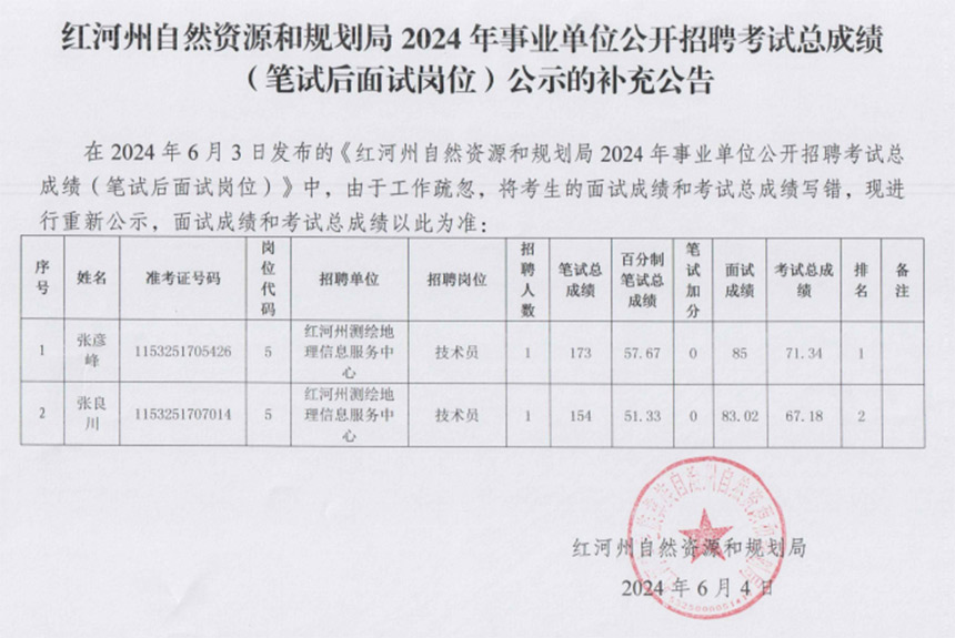 公開招聘考試總成績(jī)(筆試后面試崗位)公示的補(bǔ)充公告