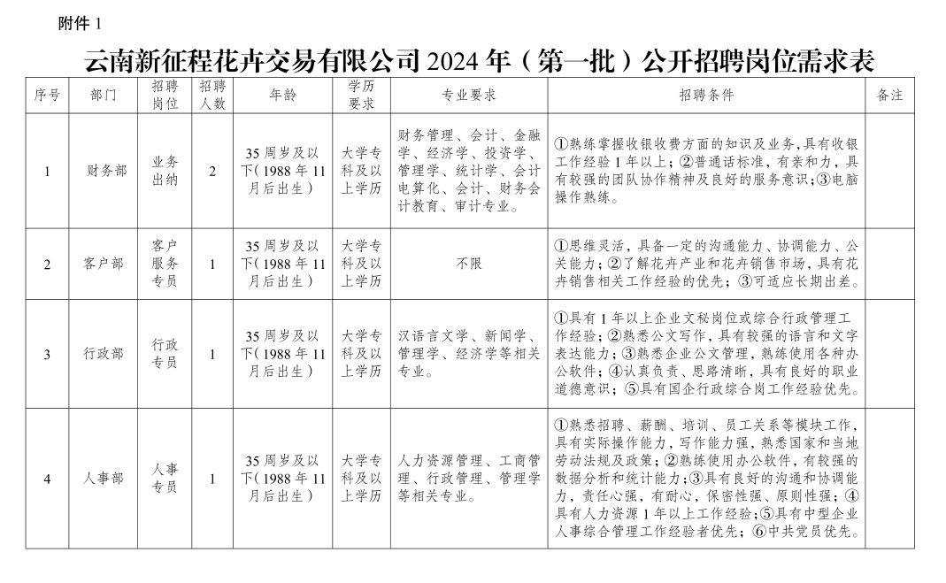 附件1:云南新征程花卉交易有限公司2024年(第一批)公開招聘崗位需求表