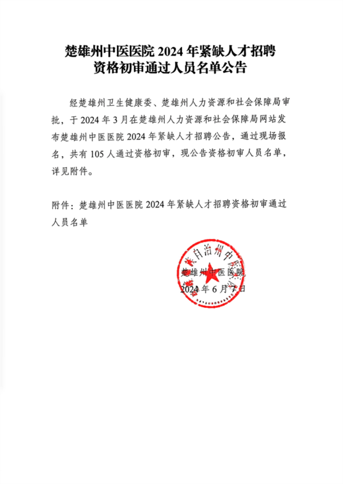 2024年楚雄州中醫(yī)醫(yī)院緊缺人才招聘資格初審通過人員名單公告