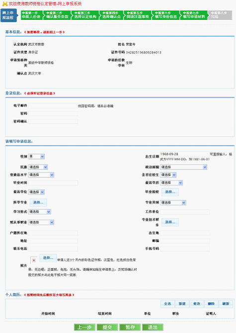 首先選擇資格種類,根據(jù)選定的資格種類控制認(rèn)定機構(gòu)下拉列表的顯示內(nèi)容。選擇省和選擇市作為篩選認(rèn)定機構(gòu)的條件,選擇了省或市后,點擊選擇認(rèn)定機構(gòu)后的“選擇”按鈕,則會顯示出所選省及市下所有能認(rèn)定申報的教師資格的認(rèn)定機構(gòu)。如果所選擇的認(rèn)定機構(gòu)沒有開通網(wǎng)報或者網(wǎng)報時間未到以及過了網(wǎng)報時間,則會給出提示,不能進行下一步,否則點擊下一步后進入申報第四步。