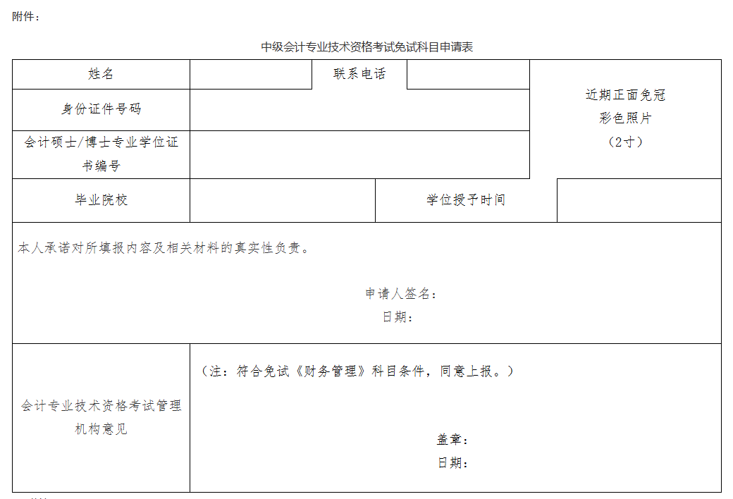 附件:中級(jí)會(huì)計(jì)專業(yè)技術(shù)資格考試免試科目申請(qǐng)表