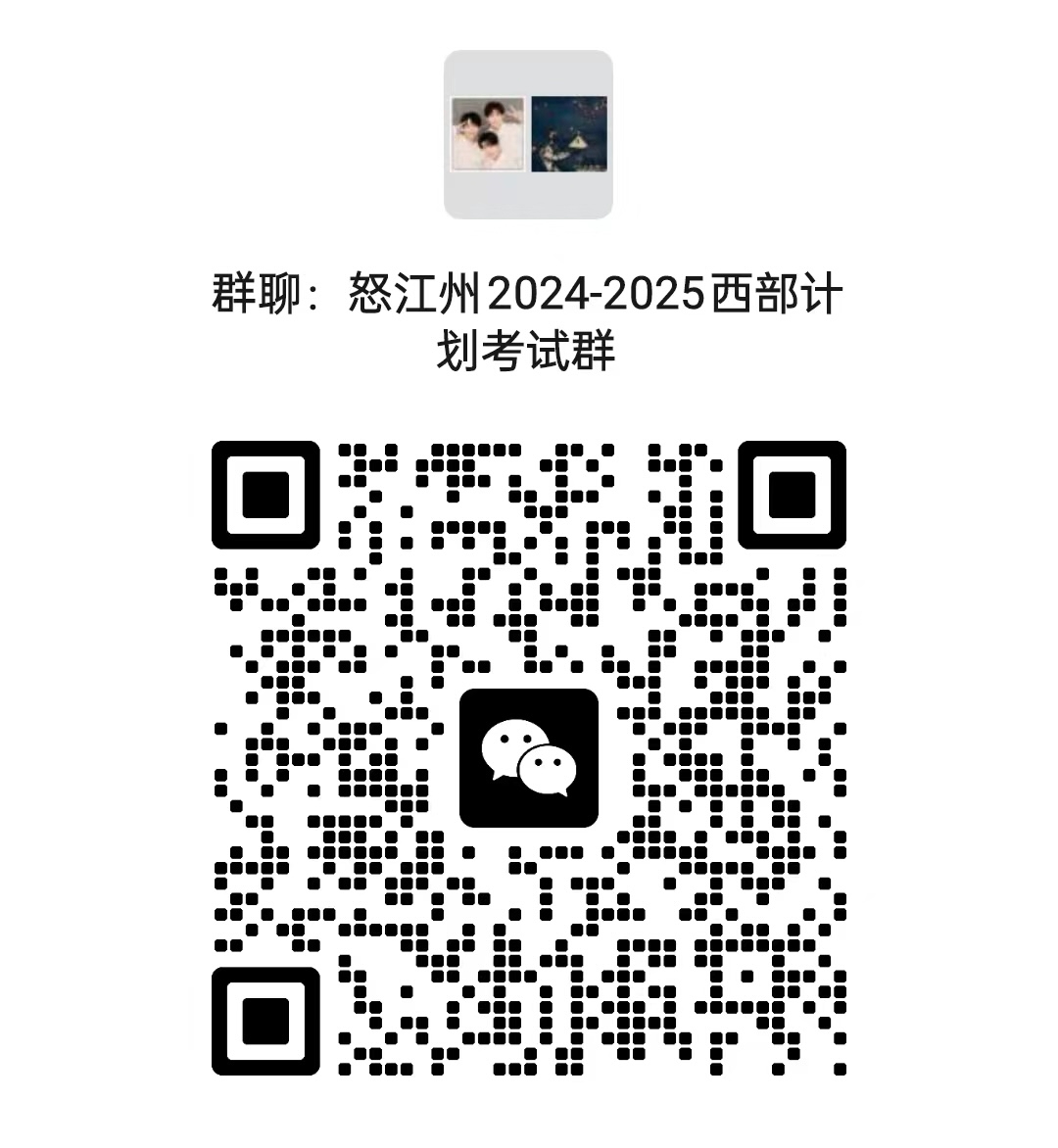 請(qǐng)通過報(bào)名審核的考生加入“怒江州2024-2025西部計(jì)劃考試群”,并修改備注:姓名+聯(lián)系方式。如果二維碼失效,無法加群,請(qǐng)及時(shí)聯(lián)系州項(xiàng)目辦。