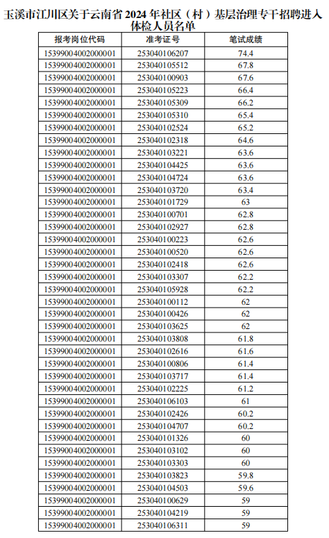 云南省2024年社區(qū)(村)基層治理專干招聘筆試、江川區(qū)資格復(fù)審工作已經(jīng)結(jié)束,根據(jù)《云南省2024年社區(qū)(村)基層治理專干招聘公告》有關(guān)規(guī)定,現(xiàn)將江川區(qū)進(jìn)入體檢人員名單進(jìn)行公布(詳見附件),并將體檢有關(guān)事宜通知如下: