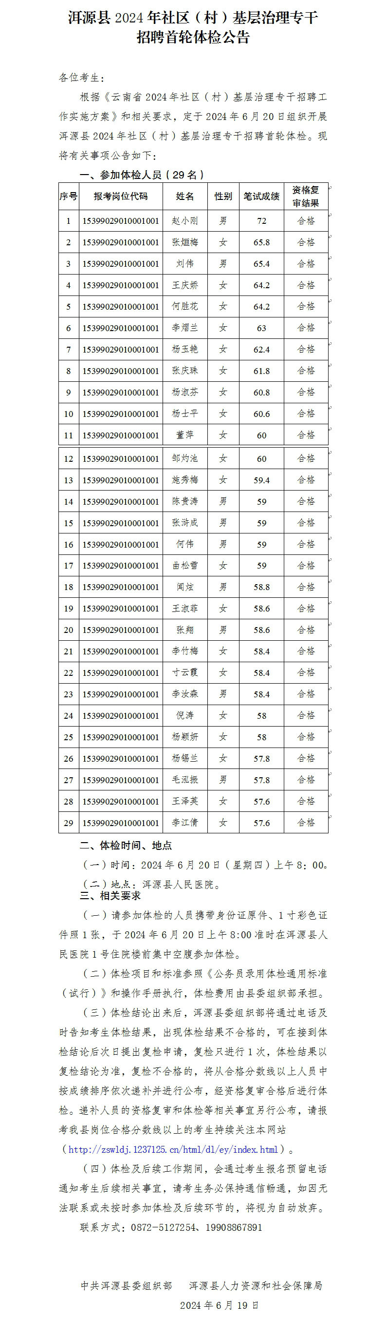 洱源縣2024年社區(qū)(村)基層治理專干招聘首輪體檢公告