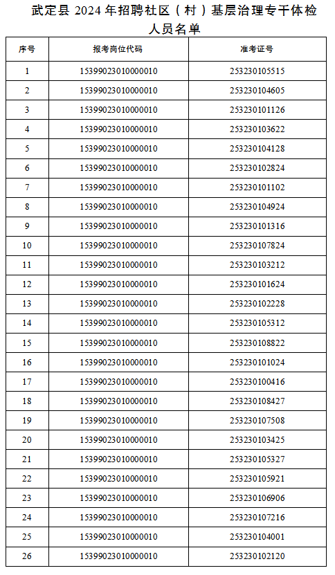 從達到云南省2024年社區(qū)(村)基層治理專干招聘資格復審合格且自愿參加體檢的考生中,等額確定參加武定縣2024年社區(qū)(村)基層治理專干招聘體檢人員。具體人員名單如下:
