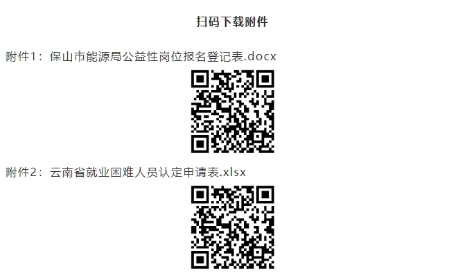 (三)報(bào)名時(shí)間和方式:自公告發(fā)布之日起至7月10日24︰00結(jié)束(以接收郵件時(shí)間計(jì)算)。報(bào)名采取網(wǎng)絡(luò)報(bào)名方式進(jìn)行,報(bào)名時(shí)需填寫《保山市能源局公益性崗位報(bào)名表》(見附件1),并提供本人居民身份證、戶口本、畢業(yè)證、《云南省就業(yè)困難人員認(rèn)定申請(qǐng)表》(附件2)、《就業(yè)創(chuàng)業(yè)證》或《就業(yè)失業(yè)登記證》等PDF格式掃描件,屬于殘疾人的還需提供《殘疾人證》(第三代)掃描件,并將報(bào)名表(含可編輯版)和掃描件發(fā)至郵箱:bssfgwnyk@163.com。聯(lián)系電話:0875—3067988,13987528618(李老師)。
