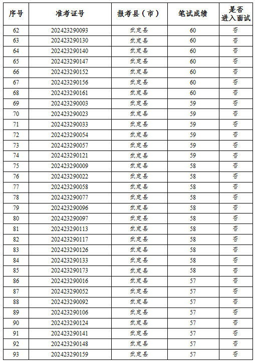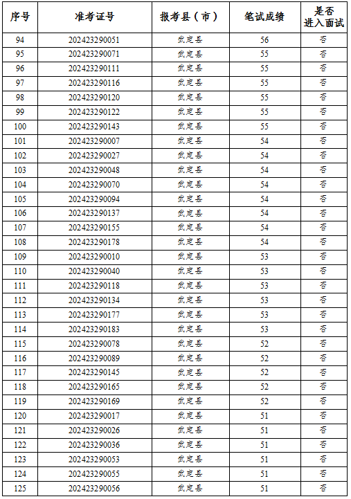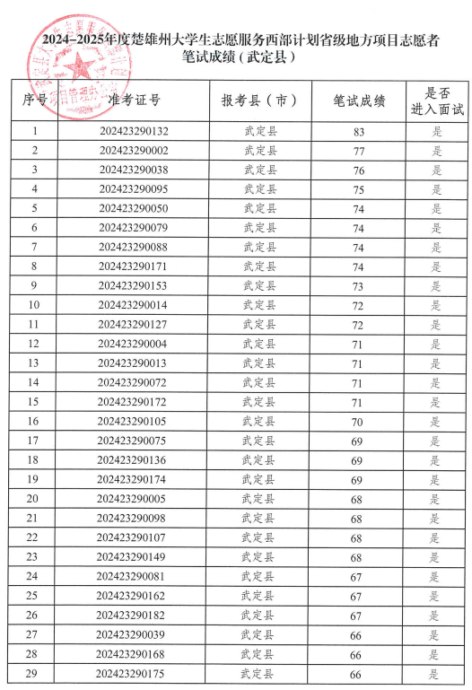 根據(jù)共青團(tuán)云南省委、云南省教育廳、云南省財(cái)政廳、云南省人力資源和社會(huì)保障廳《關(guān)于印發(fā)〈2024—2025年度云南省大學(xué)生志愿服務(wù)西部計(jì)劃實(shí)施方案〉的通知》和云南省大學(xué)生志愿服務(wù)西部計(jì)劃項(xiàng)目管理辦公室《關(guān)于做好2024—2025年度云南省大學(xué)生志愿服務(wù)西部計(jì)劃地方項(xiàng)目志愿者招募派遣工作的通知》要求,武定縣2024—2025年度計(jì)劃招錄大學(xué)生志愿服務(wù)西部計(jì)劃省級地方項(xiàng)目志愿者17名。全縣通過報(bào)名資格審核186人,縣項(xiàng)目辦于2024年6月22日下午組織開展了志愿者筆試,現(xiàn)對筆試成績予以公告。