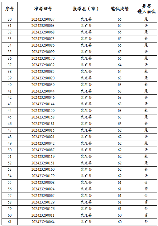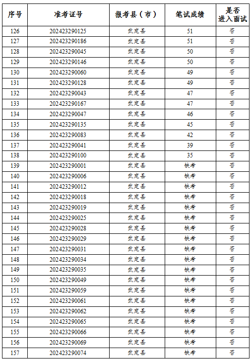 公示時(shí)間為2024年6月25日至6月27日,如考生對筆試成績有異疑,請于公示期內(nèi)向楚雄州項(xiàng)目辦書面提交查分申請(含報(bào)考縣市、姓名、準(zhǔn)考證號及考生聯(lián)系電話)。若公示無異議則根據(jù)成績從高到低按照1:3的比例確定前54名考生進(jìn)行資格復(fù)審,資格復(fù)審合格的考生領(lǐng)取面試通知書。