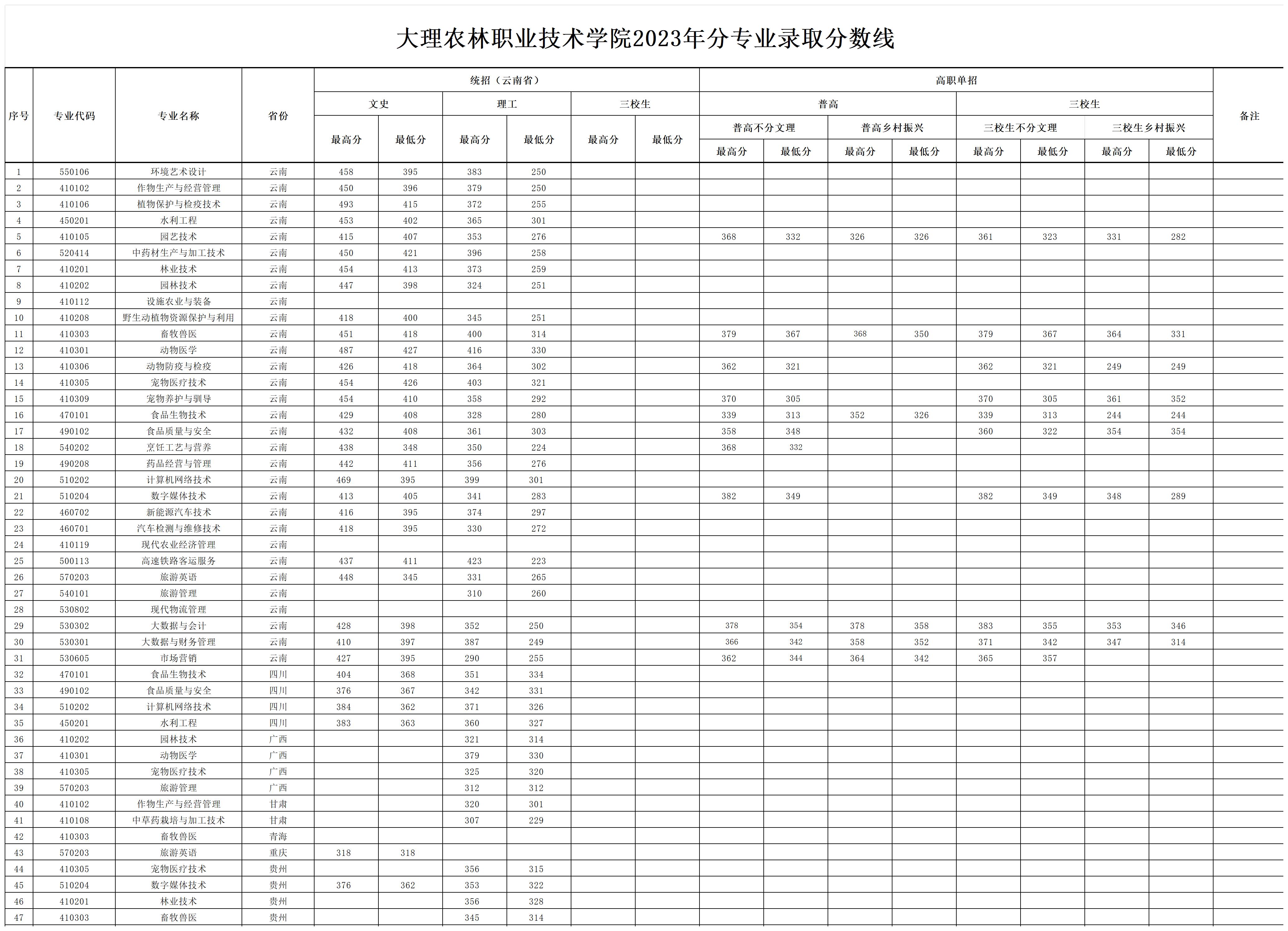 大理農(nóng)林職業(yè)技術(shù)學(xué)院2023年各專業(yè)錄取分?jǐn)?shù)線