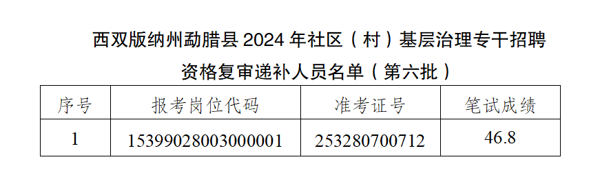 按照云南省2024年社區(qū)(村)基層治理專(zhuān)干招聘工作安排,因部分考生放棄或資格復(fù)審不合格,在筆試合格分?jǐn)?shù)線(xiàn)以上考生中,按成績(jī)由高到低順序進(jìn)行遞補(bǔ)。現(xiàn)將西雙版納州勐臘縣關(guān)于云南省2024年社區(qū)(村)基層治理專(zhuān)干招聘資格復(fù)審遞補(bǔ)人員名單(第六批)予以公示。