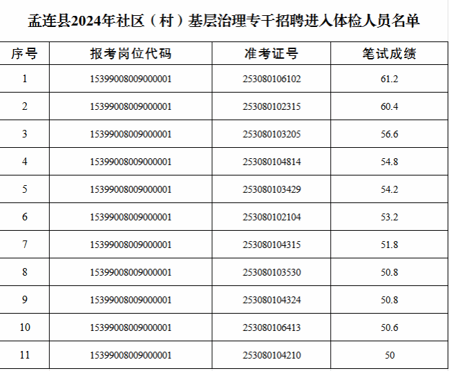 (三)參加體檢人員:報考孟連縣2024年社區(qū)(村)基層治理專干、符合《云南省2024年社區(qū)(村)基層治理專干招聘公告》規(guī)定的通過資格復(fù)審的人員。(詳見附件)