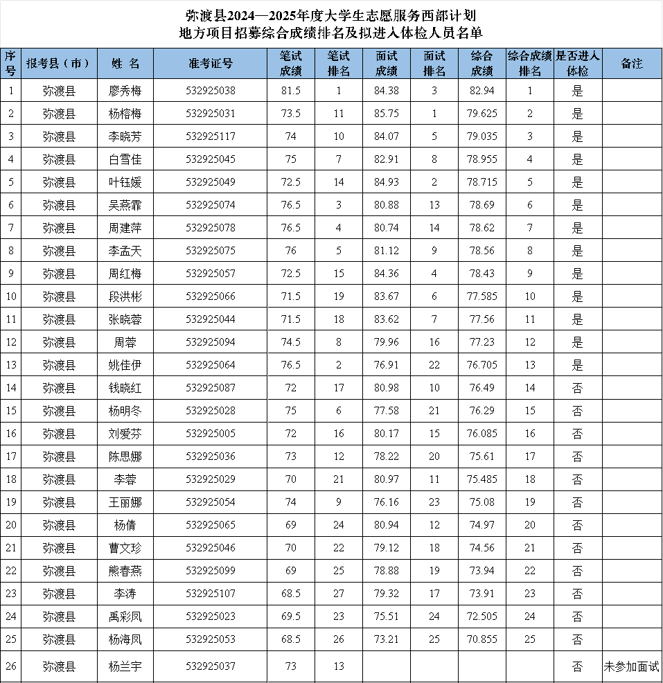 根據(jù)共青團(tuán)云南省委、云南省教育廳、云南省財(cái)政廳、云南省人力資源和社會(huì)保障廳《關(guān)于印發(fā)〈2024-2025年度云南省大學(xué)生志愿服務(wù)西部計(jì)劃實(shí)施方案〉的通知》(云青聯(lián)〔2024〕11號(hào))和云南省大學(xué)生志愿服務(wù)西部計(jì)劃項(xiàng)目管理辦公室《關(guān)于做好2024-2025年度云南省大學(xué)生志愿服務(wù)西部計(jì)劃地方項(xiàng)目志愿者招募派遣工作的通知》要求,彌渡縣2024—2025年度大學(xué)生志愿服務(wù)西部計(jì)劃地方項(xiàng)目面試工作已圓滿完成,現(xiàn)將綜合成績(jī)排名及擬進(jìn)入體檢人員有關(guān)事項(xiàng)公告如下: