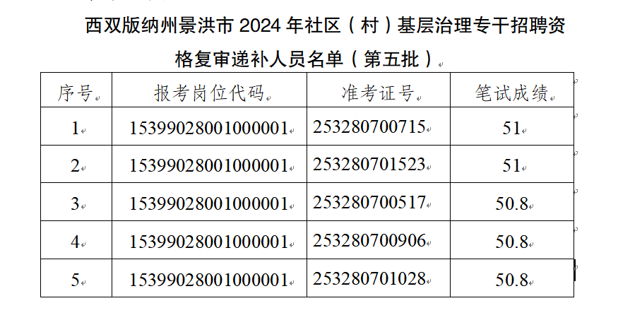 按照云南省2024年社區(qū)(村)基層治理專干招聘工作安排,因部分考生放棄或體檢不合格,在筆試合格分?jǐn)?shù)線以上考生中,按成績由高到低順序進(jìn)行遞補(bǔ)?,F(xiàn)將西雙版納州景洪市關(guān)于云南省2024年社區(qū)(村)基層治理專干招聘資格復(fù)審遞補(bǔ)人員名單(第五批)予以公示。