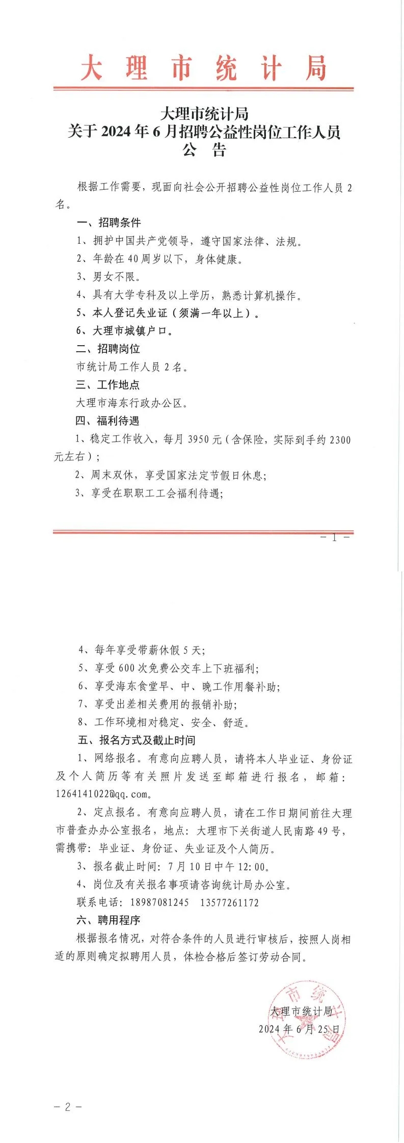 大理市統(tǒng)計局2024年6月公開招聘公益性崗位人員公告