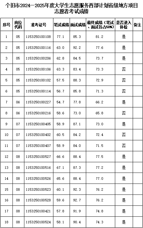 根據(jù)《紅河州2024—2025年度大學(xué)生志愿服務(wù)西部計劃地方項目志愿者招募公告》工作安排,共青團(tuán)個舊市委遵循公平、公正、公開的原則,堅決把規(guī)矩和紀(jì)律放在首位,從報名、筆試、資格審查、面試等環(huán)節(jié)嚴(yán)格把關(guān),科學(xué)制定面試實施方案,并于2024年6月28日順利完成面試招募工作?,F(xiàn)將綜合成績及擬進(jìn)入體檢人員名單予以公示,公示時間從2024年6月28日起至7月2日。