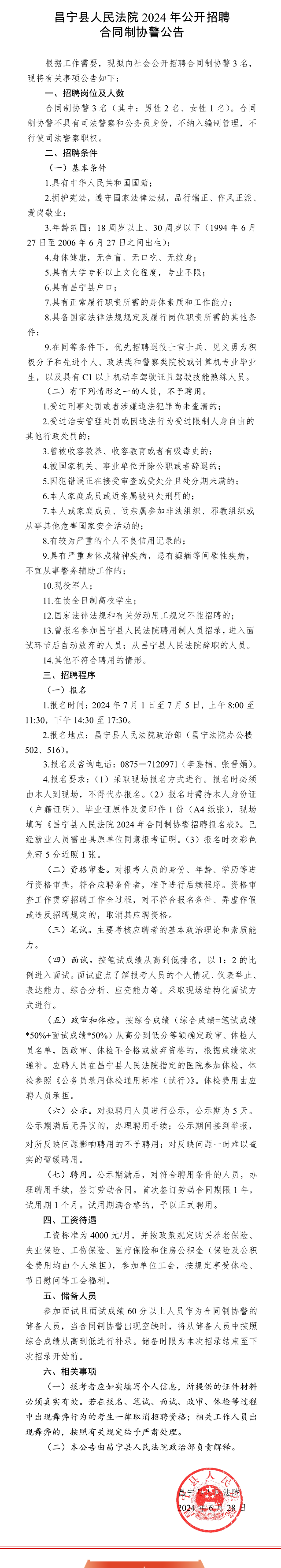 昌寧縣人民法院2024年公開(kāi)招聘合同制協(xié)警公告