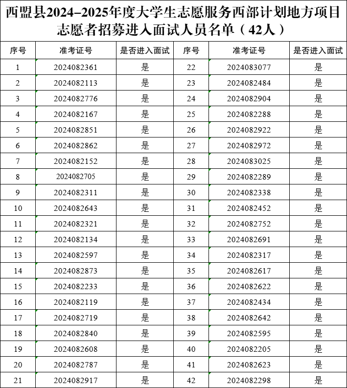 西盟縣2024—2025年度招募志愿者21人,根據(jù)筆試成績從高到低的原則,按照招募人數(shù)和筆試人數(shù)1:2的比例確定崗位面試人員,確定進(jìn)入面試42人。