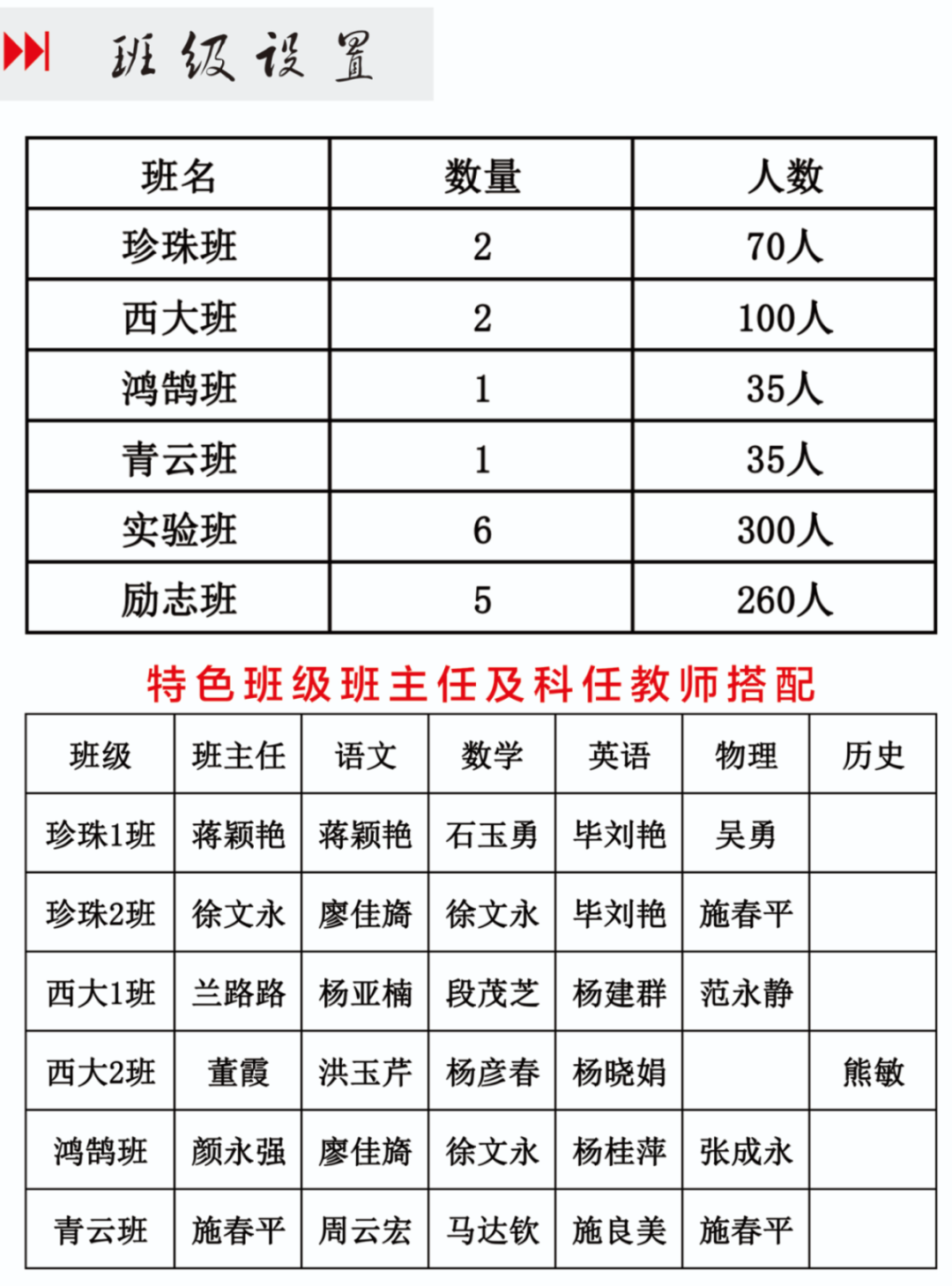 1.昌寧縣第一中學(xué)2024年計(jì)劃招收高一新生800人,共開設(shè)17個(gè)班級(jí),其中特色班級(jí)分別開設(shè)2個(gè)珍珠班(70人)、2個(gè)西南大學(xué)昌寧高中班(100人)、1個(gè)鴻鵠班(35人)、1個(gè)青云班(35人)。6個(gè)實(shí)驗(yàn)班(300人),5個(gè)勵(lì)志班(260人)。