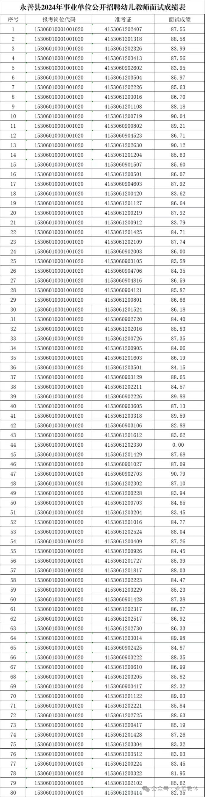 永善縣2024年事業(yè)單位公開招聘幼兒教師面試成績公示 來源:https://mp.weixin.qq.com/s/CDOHmBchCWYrHbI5FgLSsw