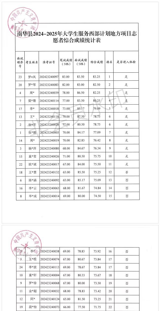 南華縣2024—2025年度大學生志愿服務西部計劃地方項目招募擬進入體檢人員名單根據報考者綜合成績從高到低順序,擬確定前12名進入體檢,名單詳見下圖。
