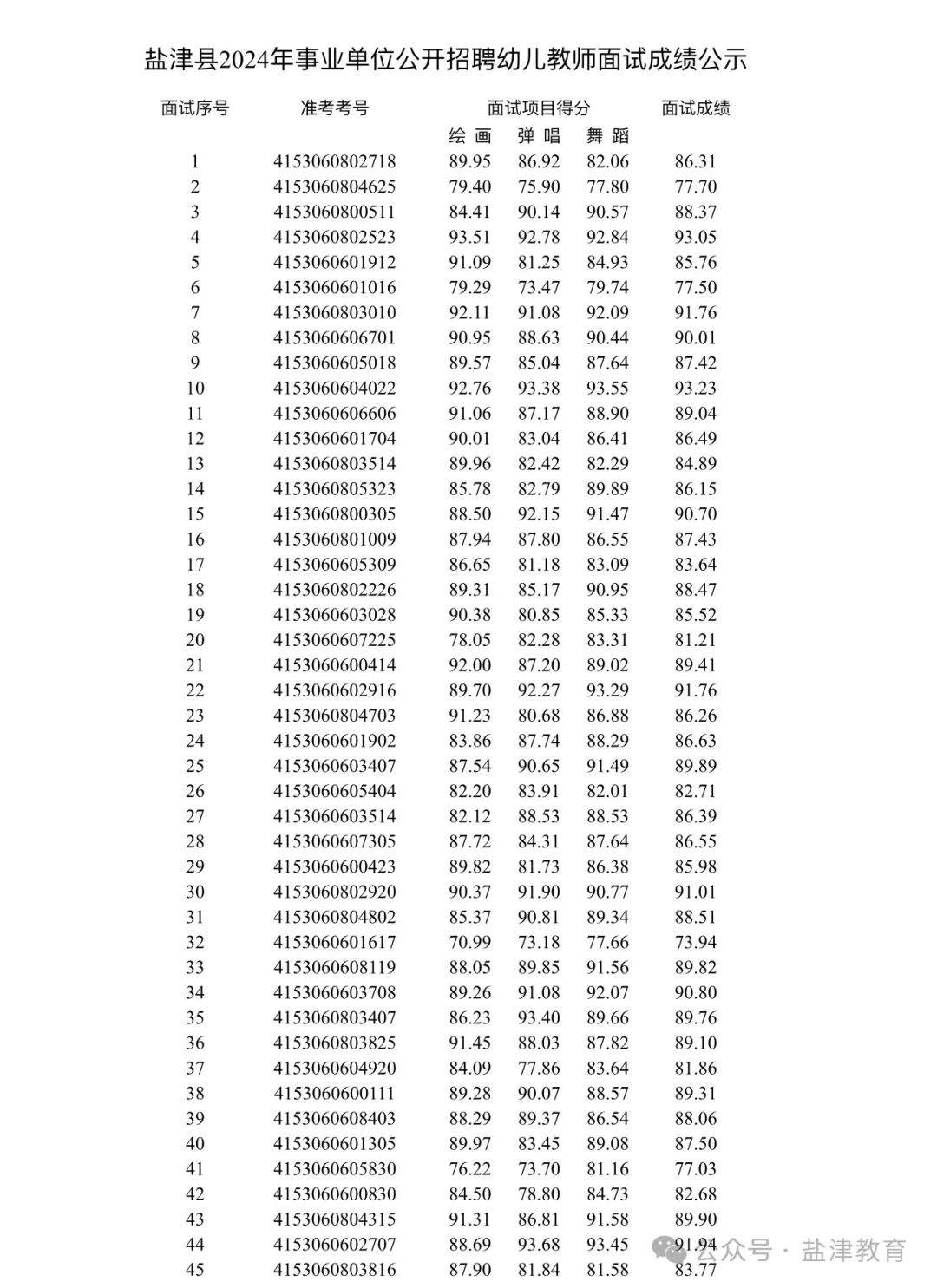 2024年鹽津縣事業(yè)單位公開招聘幼兒教師面試成績(jī)公示