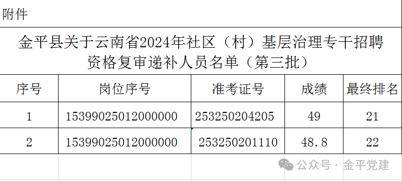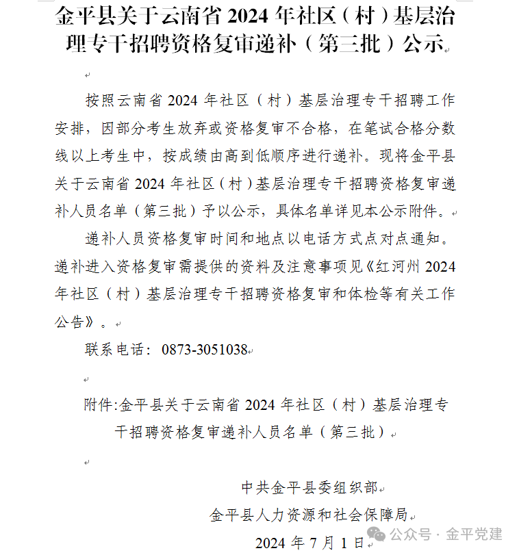 金平縣關(guān)于云南省2024年社區(qū)(村)基層治理專干招聘資格復(fù)審遞補(bǔ)(第三批)公示