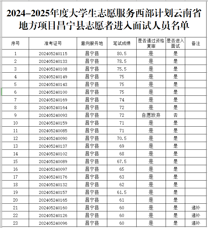 根據(jù)《共青團云南省委、省教育廳、省財政廳、省人力資源和社會保障廳關(guān)于印發(fā)<2024-2025年度云南省大學(xué)生志愿服務(wù)西部計劃實施方案>的通知》(云青聯(lián)〔2024〕11號)規(guī)定, 現(xiàn)將進(jìn)入面試人員名單及相關(guān)事項進(jìn)行通知:
