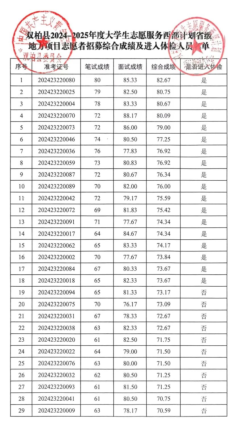 雙柏縣2024—2025年度大學(xué)生志愿服務(wù)西部計(jì)劃地方項(xiàng)目招募擬進(jìn)入體檢人員名單,根據(jù)報(bào)考人員綜合成績(jī)從高到低順序,擬確定前18名進(jìn)入體檢,名單詳見下圖。
