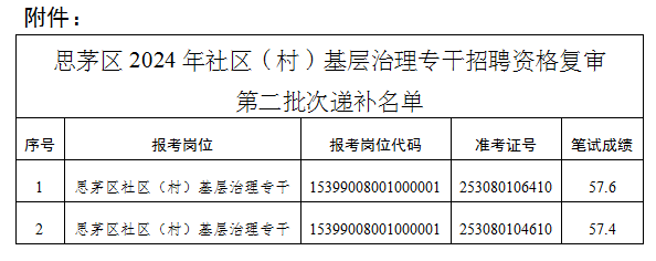 附件:思茅區(qū)2024年社區(qū)(村)基層治理專干招聘資格復(fù)審第二批次遞補(bǔ)名單