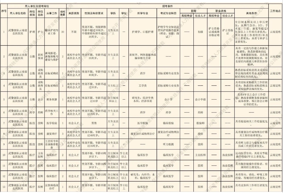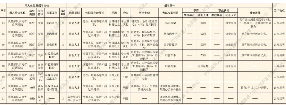 武警云南總隊醫(yī)院2024年社會聘用人員招聘公告