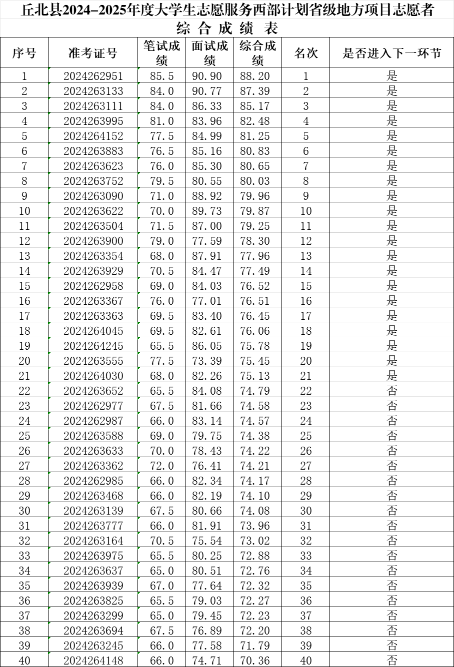 根據(jù)丘北縣2024—2025年度大學(xué)生志愿服務(wù)西部計(jì)劃省級(jí)地方項(xiàng)目志愿者招募程序和《關(guān)于做好2024—2025年度云南省大學(xué)生志愿者服務(wù)西部計(jì)劃地方項(xiàng)目志愿者招募派遣工作的通知》《關(guān)于做好文山州2024—2025年度西部計(jì)劃省級(jí)地方項(xiàng)目志愿者招募工作的通知》相關(guān)要求,丘北縣項(xiàng)目辦于2024年7月3日組織開(kāi)展面試,現(xiàn)將丘北縣2024年招募大學(xué)生志愿服務(wù)西部計(jì)劃省級(jí)地方項(xiàng)目志愿者綜合成績(jī)進(jìn)行公示。