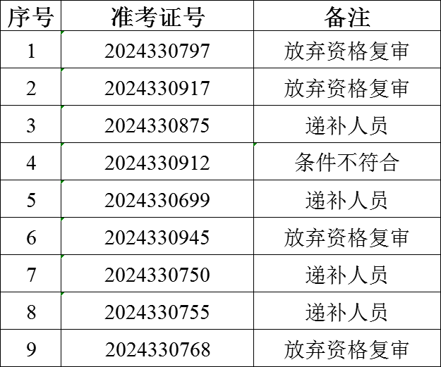 根據(jù)怒江州大學生志愿服務(wù)西部計劃項目管理辦公室關(guān)于做好怒江新招募大學生志愿服務(wù)西部計劃省級地方項目志愿者面試及后續(xù)錄用工作的要求,對瀘水市2024—2025年度大學生志愿服務(wù)西部計劃地方項目招募資格復(fù)審期間,因考生放棄等原因出現(xiàn)缺額,擬從報考瀘水崗位的考生中,按筆試成績從高到低的順序依次遞補參加資格復(fù)審確認?,F(xiàn)將遞補人員名單公布如下: