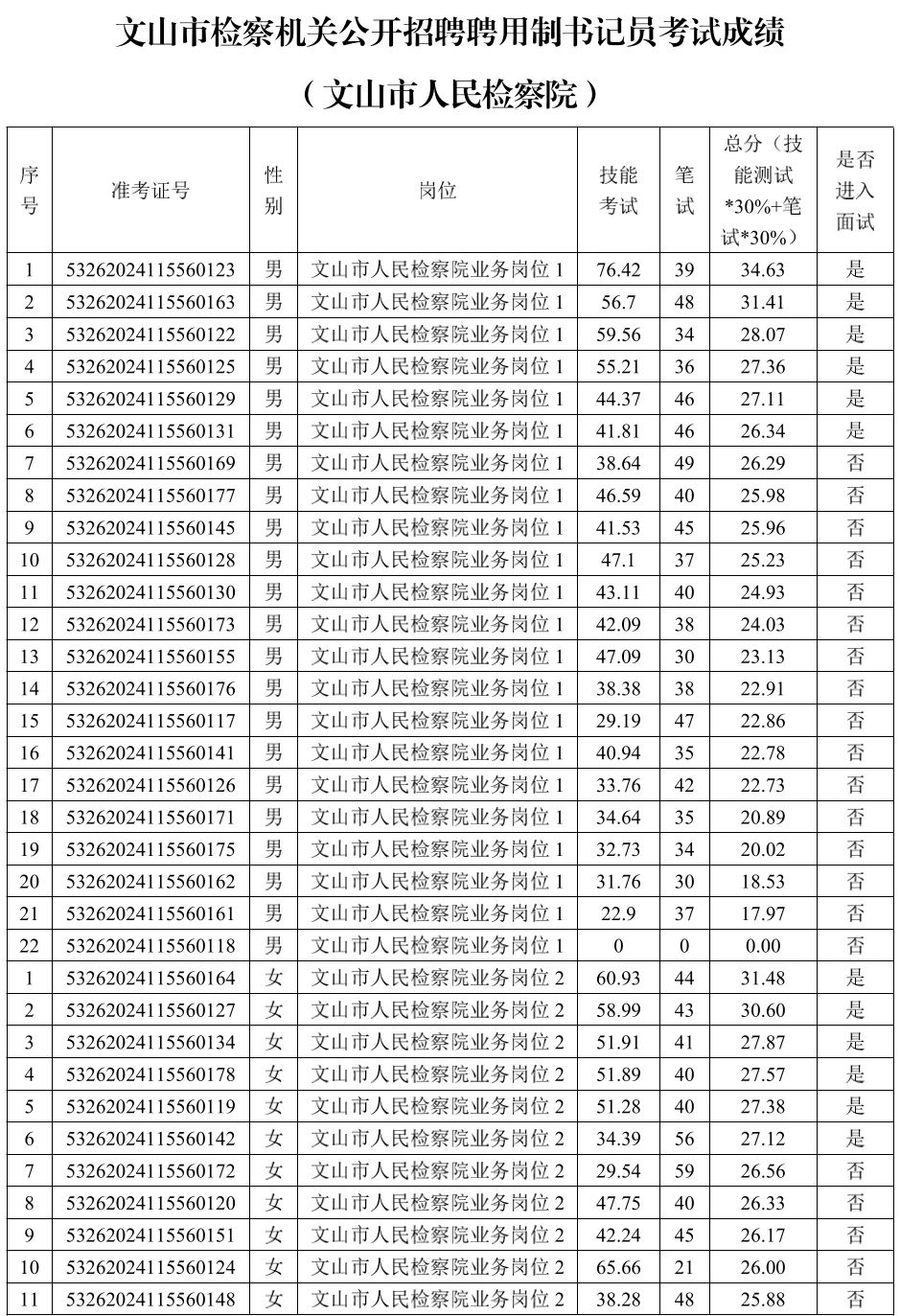 五、文山州檢察機關2024年公開招聘聘用制書記員筆試、技能測試成績排名(文山市人民檢察院)。